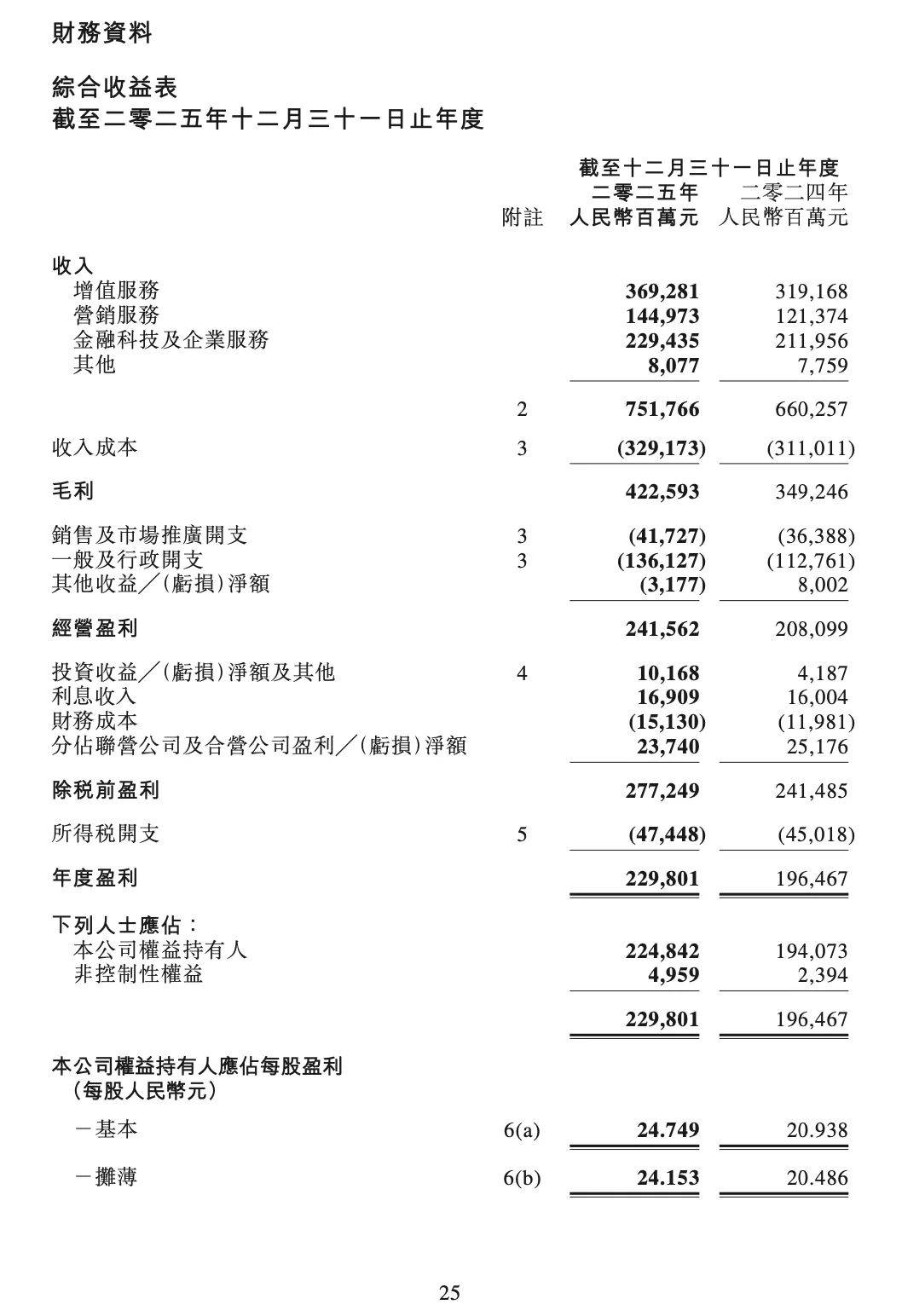 翻开25页,可以看到综合收益表,也就是利润表。它记录了腾讯在整个2025年是怎么赚钱的,以及赚了多少钱。