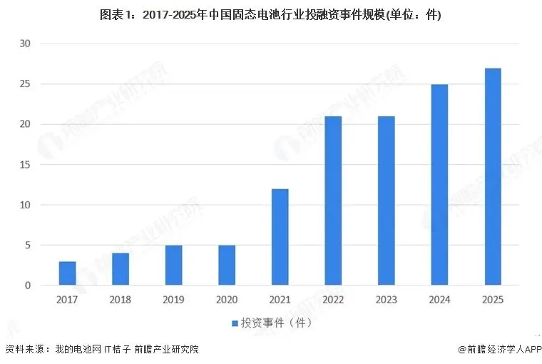从固态电池行业投融资来看,2017-2020年行业处于早期探索阶段,投融资事件数维持在2-5件的低位区间小幅波动;2021年事件数从4件大幅增长至12件,资本关注度显著提升,行业发展迎来拐点;2022年事件数进一步增至21件,增长势头强劲;2023年保持21件的水平,市场进入阶段性平稳期;2024-2025年事件数分别增至25件、27件,呈现稳步增长态势,反映出随着固态电池技术逐步成熟、产业化进程加速,资本持续加码布局这一赛道。