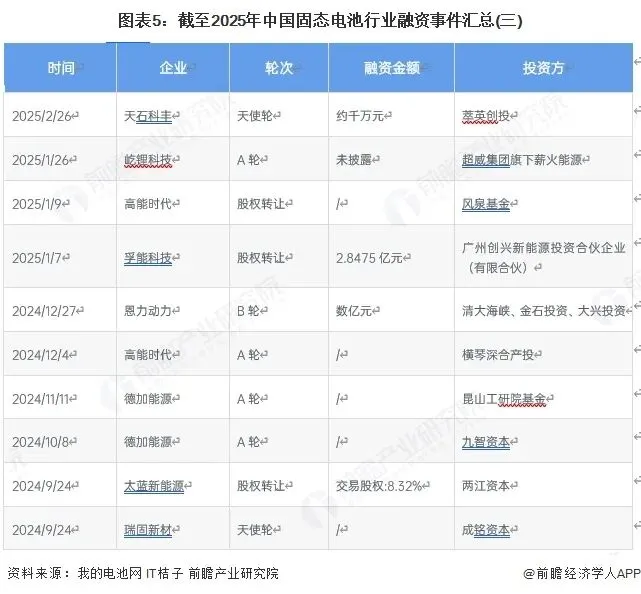 2017-2025年中国固态电池行业主要的融资事件如下所示: