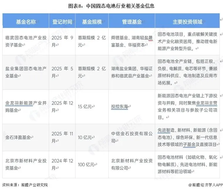 中国固态电池行业密集设立多只专项基金,规模梯度差异显著,首期规模从2亿元到100亿元不等,管理机构涵盖舜锂基金、湖南盐业集团、投控东海、中信金石、北京新材料产业投资有限公司等产业资本、券商及专业投资主体,投资领域覆盖固态电池关键材料研发、全产业链布局及上下游并购整合,为行业关键技术产业化突破与锂电新能源产业转型升级提供了有力的资本支撑。