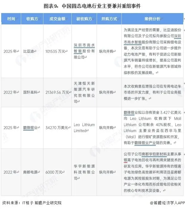 从中国固态电池行业主要兼并重组事件来看,比亚迪、国轩高科、赣锋锂业、南都电源等企业分别斥资收购锂电设备、专用电动车研发、锂矿资源、电池回收利用等领域标的,交易金额从数千万元到数亿美元不等,通过纵向整合产业链上下游资源,实现提升固态电池产能、完善锂资源布局等目标,契合企业长期发展战略。