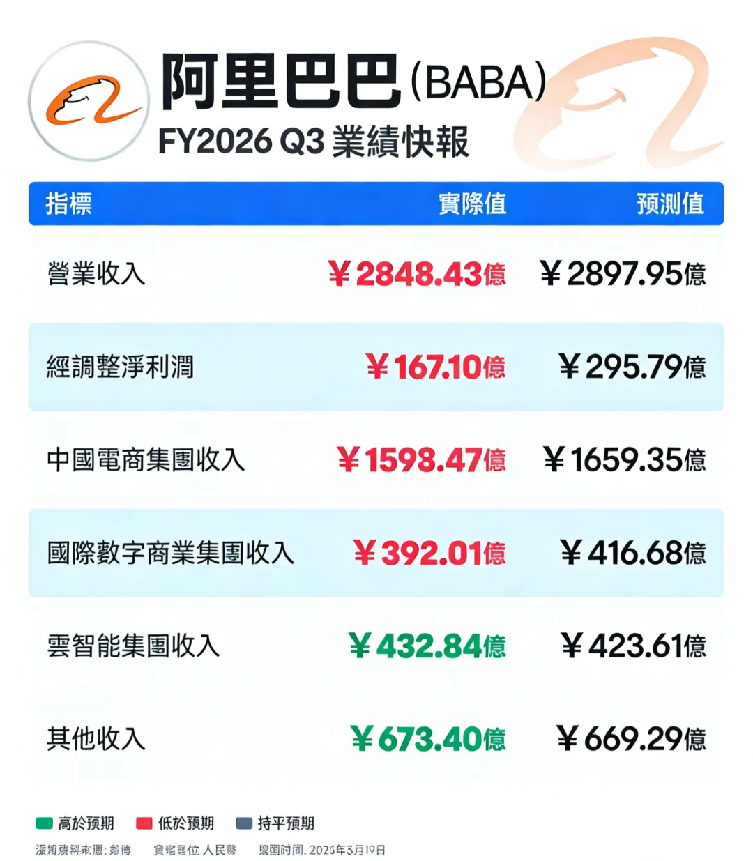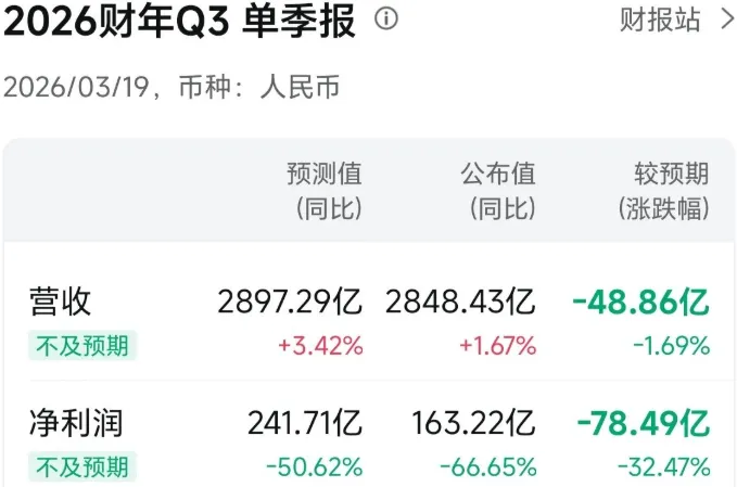 3月19日,阿里发布的2026财年Q3财报(2025年10月至12月)。财报显示营收2848.43亿,同比增长2%。阿里巴巴中国电商集团累计收入1593.47亿元,同比增长6%。其中,电商业务的收入为1315.83亿元,即时零售的收入同比增长56%至208.42亿元,中国批发商业的收入为69.22亿元。