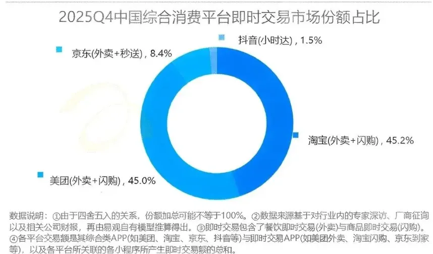 同期美团预亏233-243亿,利润蒸发600亿,阿里以45.2%的即时交易市场份额微超美团0.2个百分点,0.2% 的差距背后是阿里千亿级的补贴消耗。