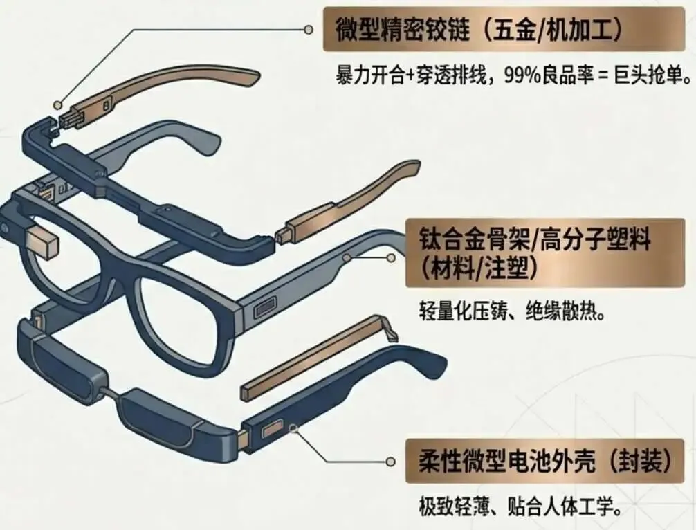 五金/机械加工厂的利润池: 眼镜的铰链(折叠处)。一天要被暴力开合几十次,里面还要穿过极其微小的排线,既要耐用又要丝滑。如果你能把这种微型精密铰链的良品率干到 99%,苹果和 Meta 的采购经理会天天蹲在你们厂门口。 材料/注塑厂的利润池: 钛合金骨架的轻量化压铸、能散热但不导电的特殊高分子塑料、能弯曲的柔性微型电池封装外壳。