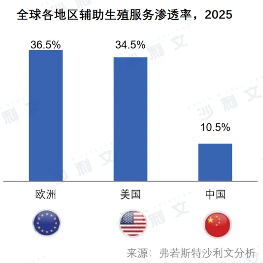 随着辅助生殖需求增长及技术水平提升,中国ART渗透率持续提高。到2025年,中国辅助生殖服务渗透率提升至10.5%,与欧美差距逐步缩小,行业具有较大的发展潜力。