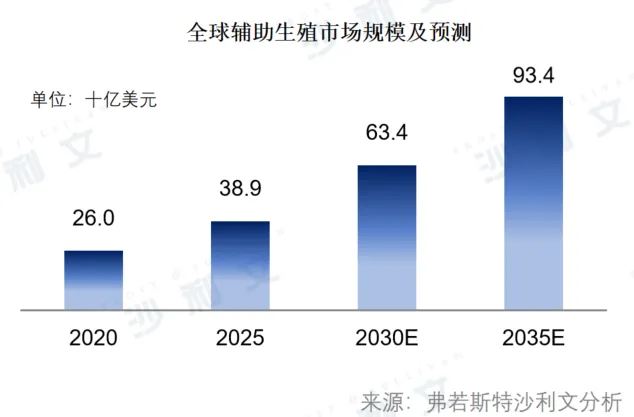 全球辅助生殖服务市场规模持续增长。2020年市场规模约为260亿美元,预计2025年增长至389亿美元。