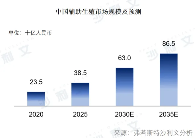 2020–2030年,在高龄不孕比例上升及治疗渗透率提升驱动下,中国辅助生殖市场处于需求释放阶段,市场规模由235亿元增长至630亿元。2030年以后,市场逐步进入稳态发展阶段,2035年预计将增长至865亿元。过去两年受宏观经济波动、居民财富预期调整及疫情后生育决策延迟影响,需求阶段性后移。随着宏观环境改善及延迟需求释放,预计2026–2027年将成为中国辅助生殖行业由调整期向复苏期过渡的关键拐点,行业逐步回暖。