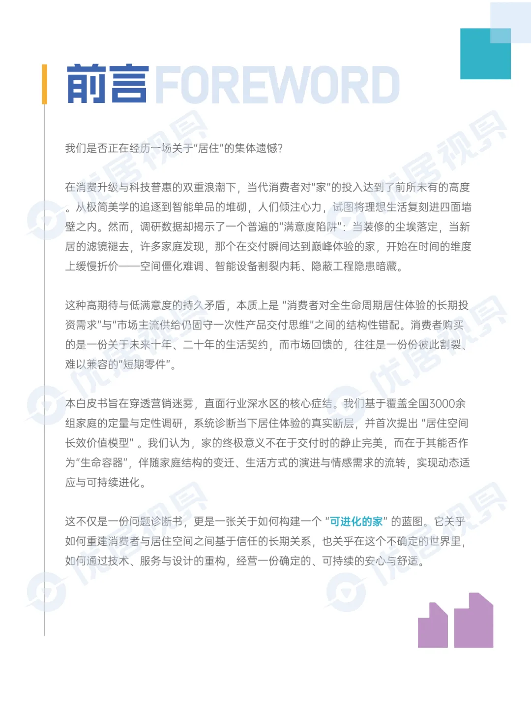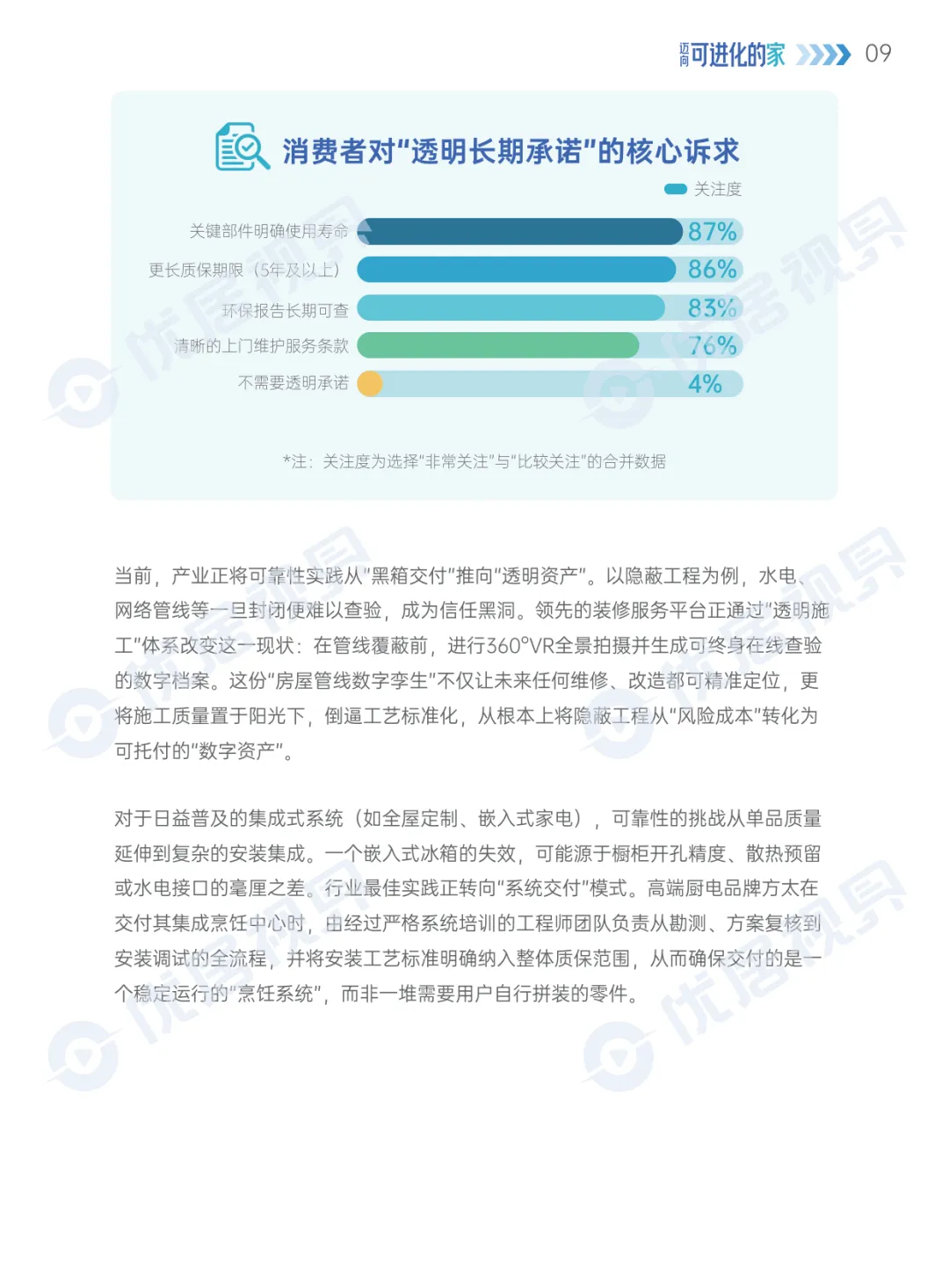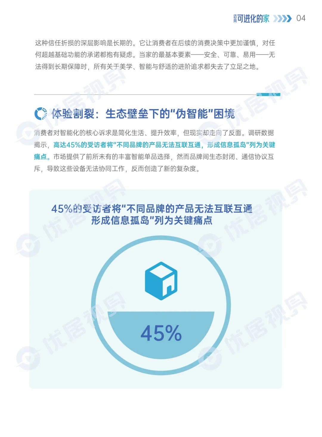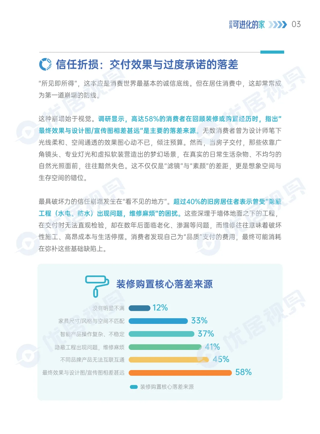 调研显示,超 70% 消费者装修时重视智能化、环保健康等目标,但居住 3 年以上群体中,超半数对长期舒适安心度评分不足 4 分(5 分制),核心症结在于三大价值断层:一是信任折损,58% 消费者反映交付效果与宣传差距大,超 40% 旧房居住者受隐蔽工程问题困扰;二是体验割裂,45% 受访者吐槽智能设备品牌间无法互联互通,仅 24% 对全屋智能持明确向往;三是未来锁死,61% 居住 3 年以上的受访者面临空间无法适配家庭需求变化、产品功能老化问题,55% 因成本和装修破坏顾虑放弃局部改造。