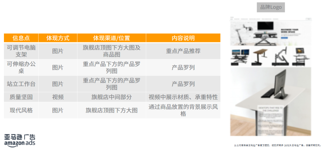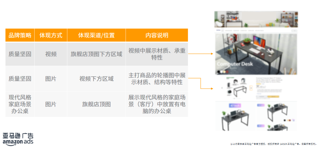 以上图为例子,产品的品牌策略为: ① 质量坚固 ②现代风格 ③家庭场景 ④办公桌(电脑桌)-- 范围为“办公桌”