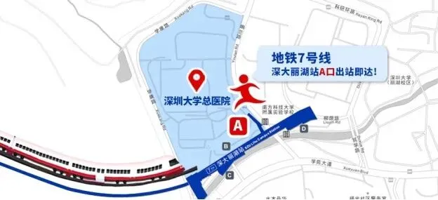 地铁:地铁7号线延长线-深大丽湖站,A口出站即达深大总医院。地铁5号线-塘朗站,乘坐B617公交接驳专线至深圳大学总医院门诊。
