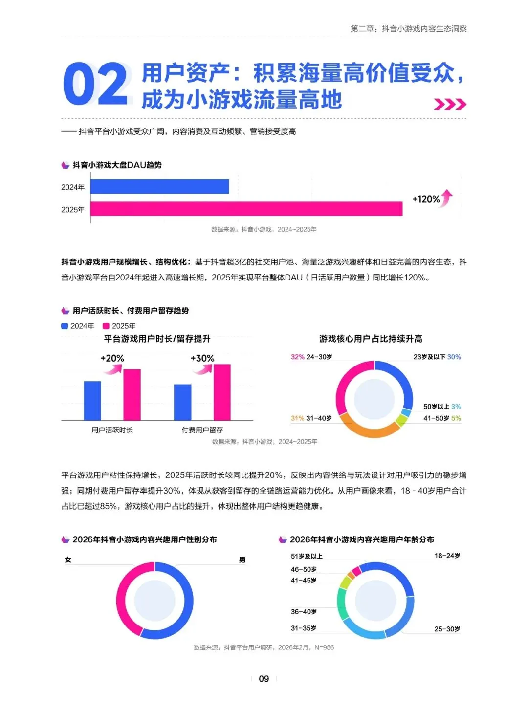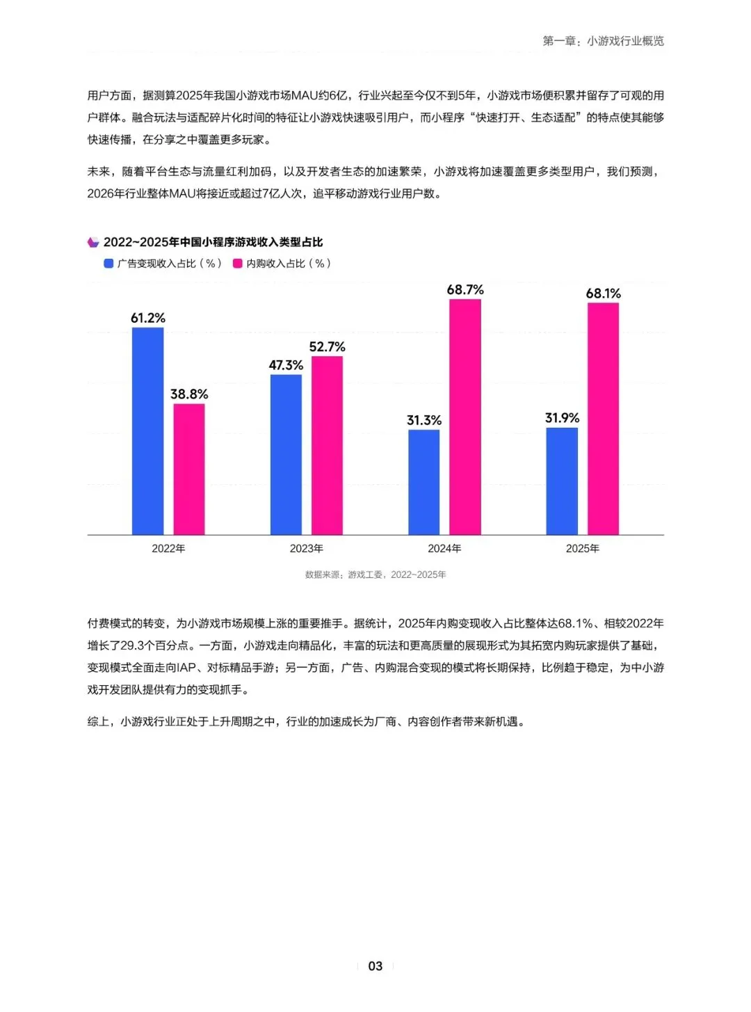 2025年,我国小程序游戏市场规模达535.4亿元、同比增长34.44%;结合行业发展趋势预测,2027年小程序游戏市场规模将突破千亿大关。用户量级的稳步攀升、玩法的持续丰富、付费模式的融合优化,为小游戏市场能够持续增长的关键。