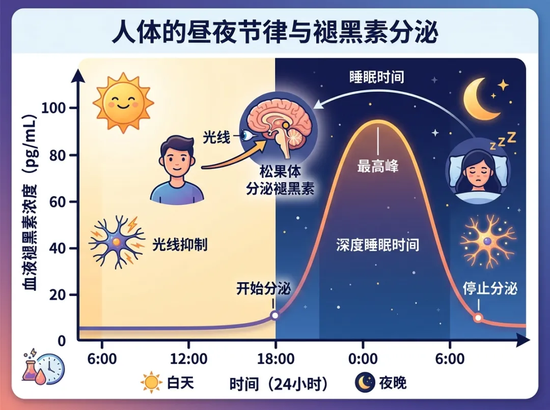 褪黑素是我们自己可以产生的一种激素,夜间水平升高,帮助入睡;白天降低,帮助清醒。