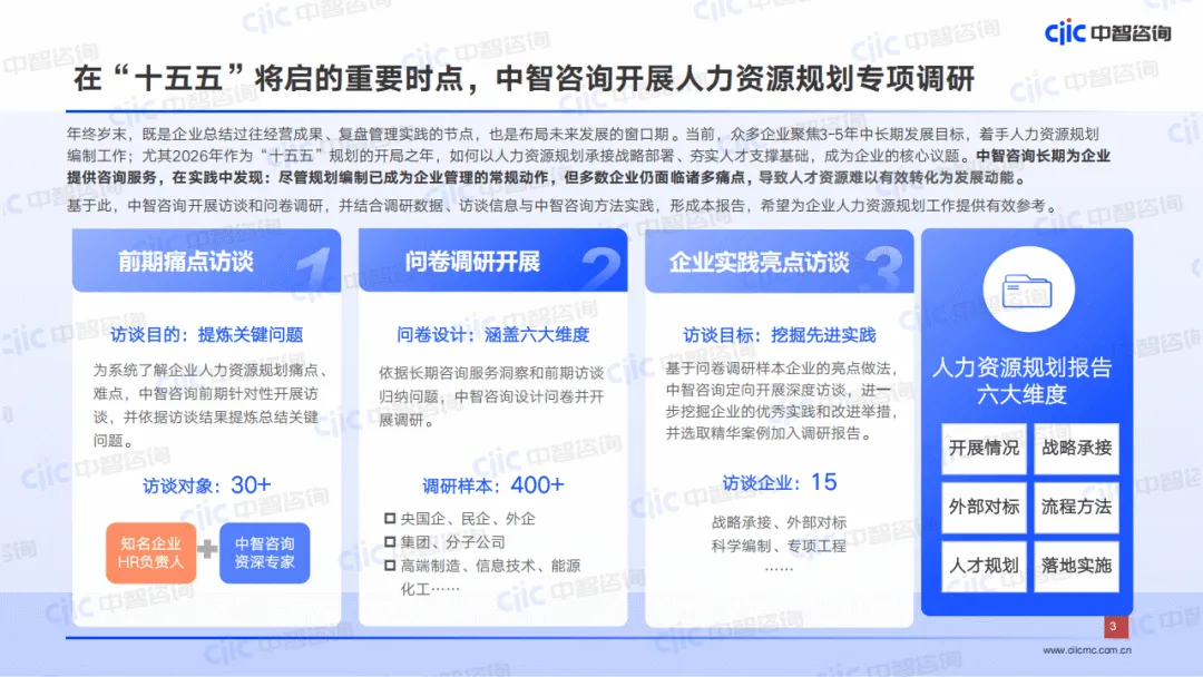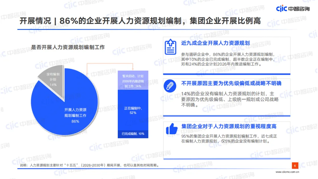 中智咨询2025年12月发布的企业“十五五”人力资源规划调研报告,基于30+前期访谈、400+问卷调研及15家企业深度访谈,聚焦企业人力资源规划9大关键问题,剖析了当前企业人力规划的现状、痛点并给出改进方向。调研显示,86%的企业已开展“十五五”人力规划编制,集团企业重视度更高,但行业整体在战略承接、科学编制、落地实施环节仍存在显著短板。
