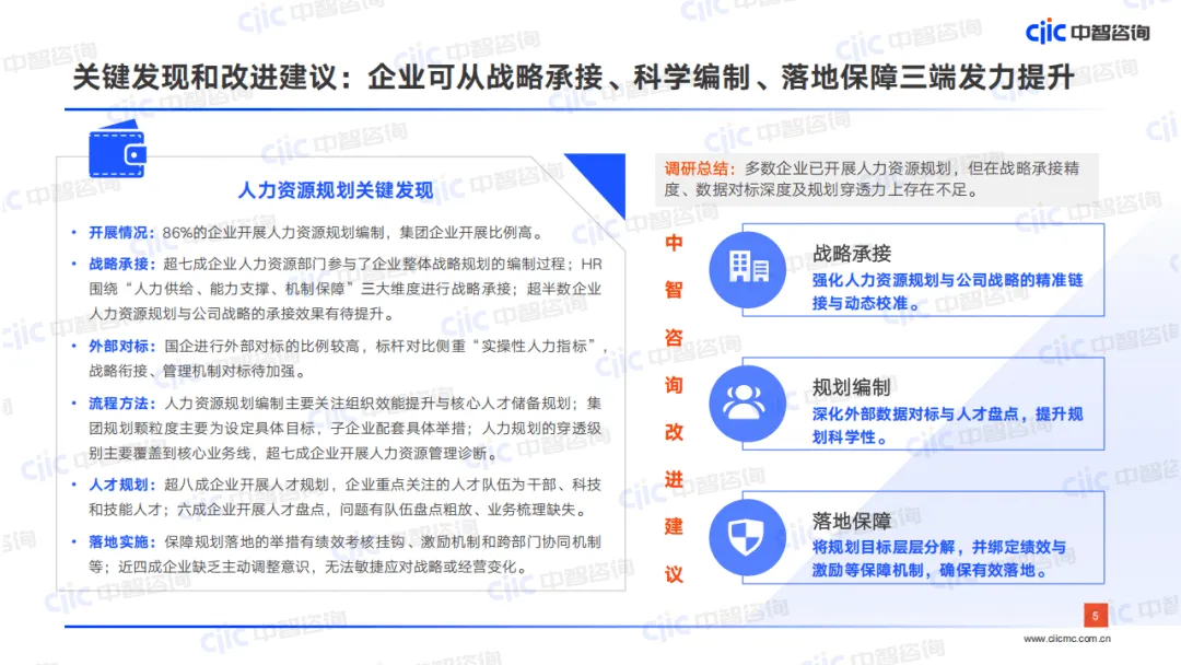 针对以上问题,报告提出企业需从三端发力:战略承接上强化与公司战略的精准链接和动态校准,加大专业工具与深度协同应用;科学编制上深化外部数据对标与“三位一体”人才盘点,提升规划颗粒度与穿透性;落地保障上将目标层层分解,绑定绩效激励机制,建立敏捷的规划回顾调整体系,同时推进组织优化、核心人才引育等专项工程,让人力规划真正转化为企业发展动能。