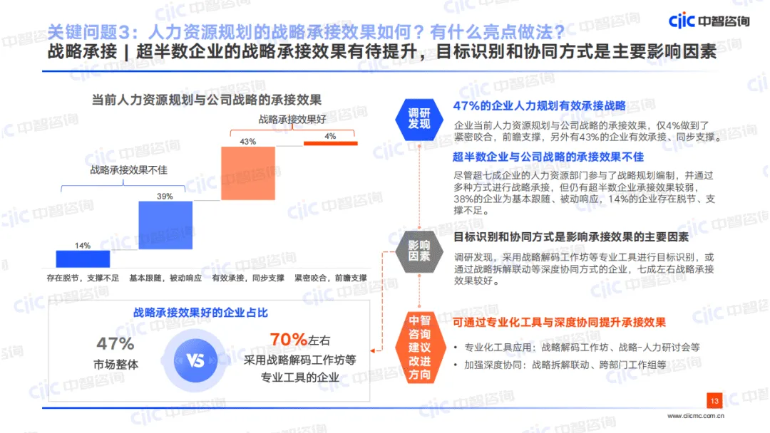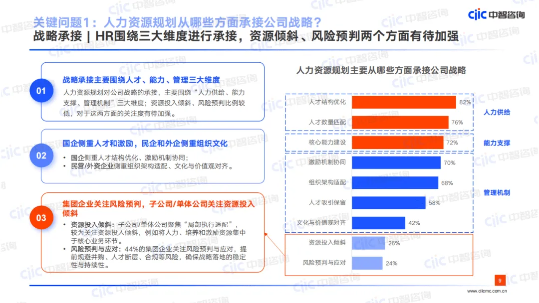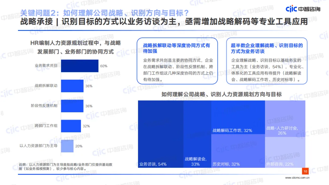 战略承接方面,75%的企业人力部门参与战略规划编制,集团企业深度参与比例更高,HR主要从人力供给、能力支撑、管理机制三大维度承接战略,但资源倾斜、风险预判关注度不足;超半数企业战略承接效果不佳,主要因专业工具应用少、深度协同不足,仅以业务访谈为主要目标识别方式,战略解码等工具应用率低。