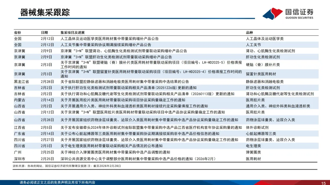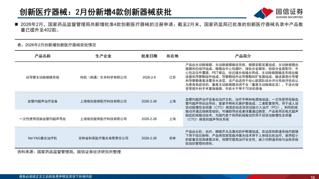 国家医保局1月20日发布《手术和治疗辅助操作类医疗服务价格项目立项指南(试行)》,指南设立导航、参与执行、精准执行等价格项目,打破手术入路、应用部位、国内外品牌等传统限制,让智能化的创新产品临床应用获得合理收费标准。腔镜和骨科手术机器人出海加速,截至2月12日,微创旗下图迈手术机器人全球商业化订单突破两百台,覆盖近五十个国家和地区,已完成商业化装机近130台。天智航的骨科手术导航定位系统及工具包已获得CE认证,多渠道拓展海外市场。