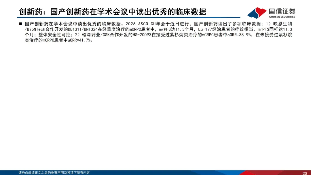 近期,国产创新药在学术会议上读出优秀的临床数据,建议关注二季度的ASCO等重磅学术会议。26Q1以来,国产创新药的出海趋势仍在继续,基于技术平台的多项目的合作协议表明了中国创新药的研发能力不断获得跨国药企的认可,中国创新药的效率优势、成本优势得到持续的体现。