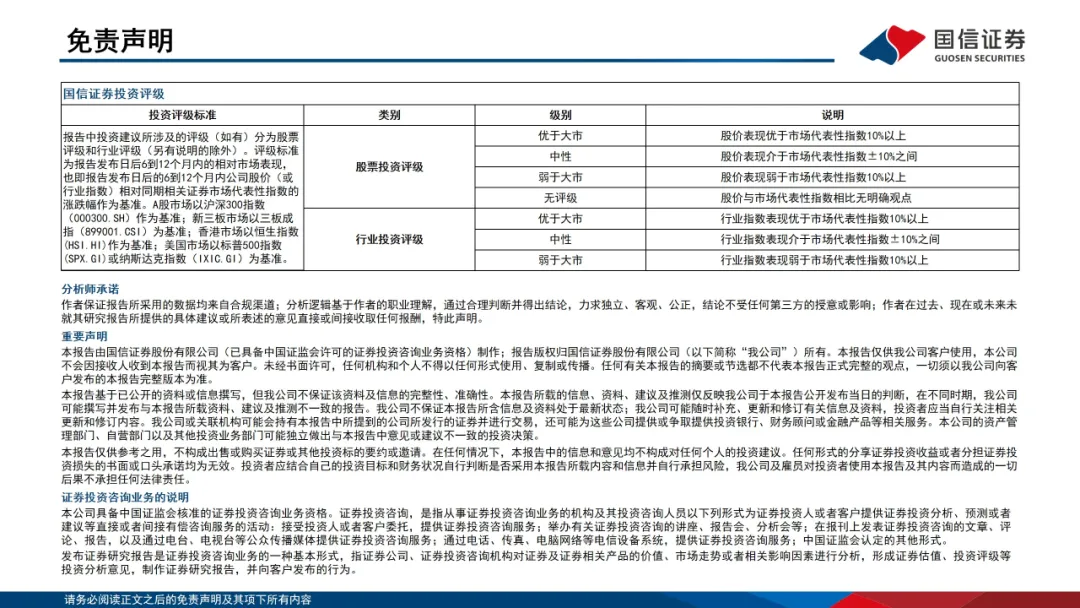 国信证券对本公众号所载资料的准确性、可靠性、时效性及完整性不作任何明示或暗示的保证。本公众号中资料、意见等仅代表来源证券研究报告发布当日的判断,相关研究观点可依据国信证券后续发布的证券研究报告在不发布通知的情形下作出更改。国信证券的销售人员、交易人员以及其他专业人士可能会依据不同假设和标准、采用不同的分析方法而口头或书面发表与本公众号中资料意见不一致的市场评论和/或观点。
