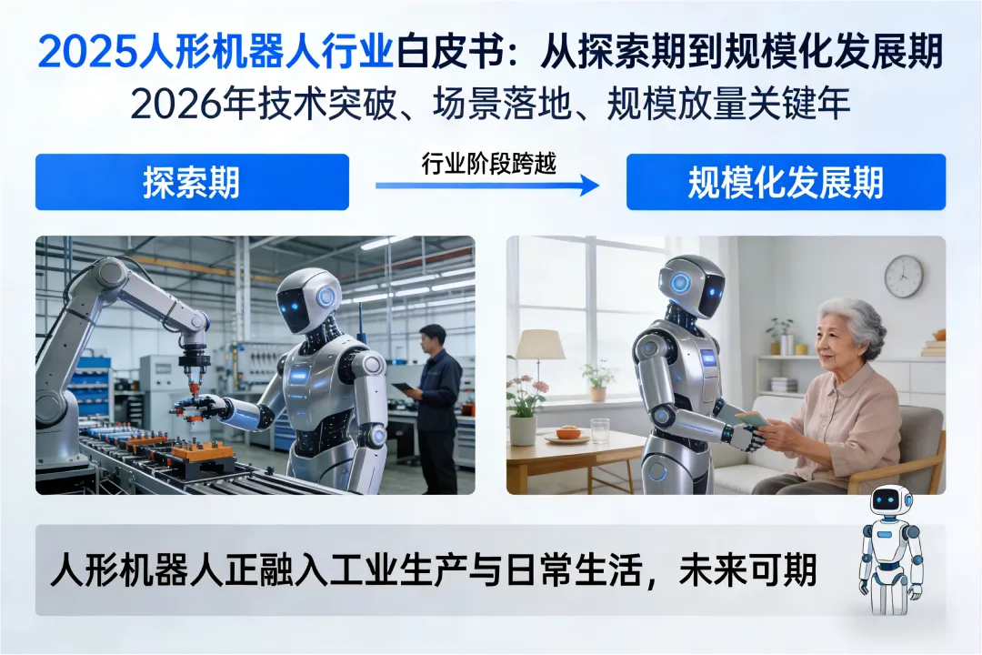 《2025人形机器人行业白皮书》明确宣告,行业从“探索期”迈入“规模化发展期”,2026年就是技术突破、场景落地、规模放量的关键一年!人形机器人正在悄悄融入工业生产和日常生活,未来可期,赶紧码住,下次聊起行业就能轻松“露一手”~