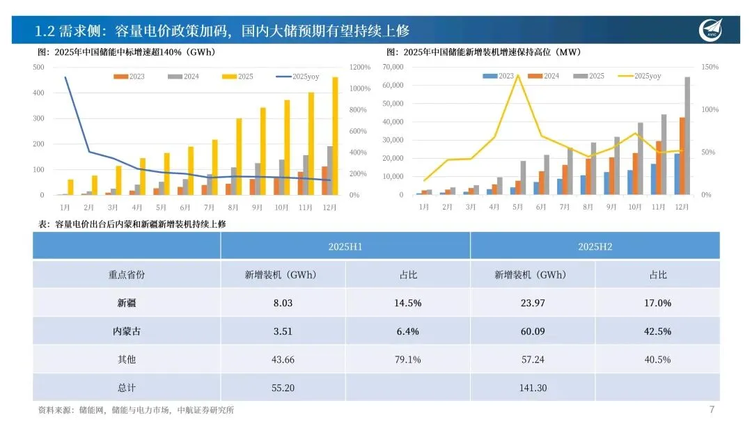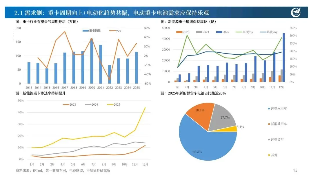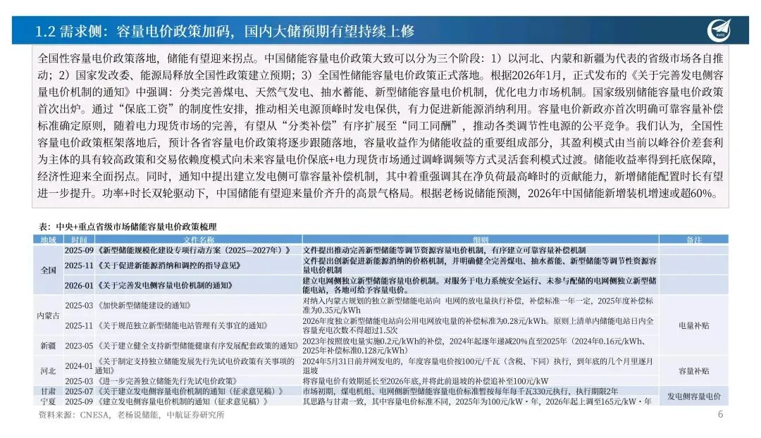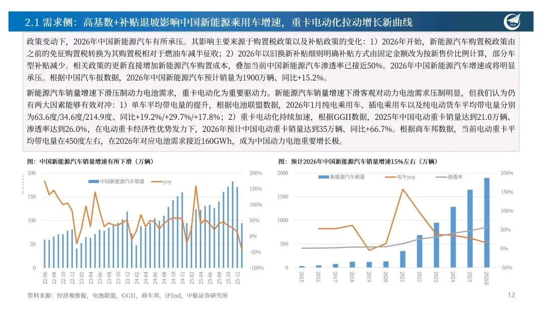 需求端韧性远超市场预期,核心增量来自两大主线。一是电动重卡2026年销量增速预计达66.7%,叠加乘用车单车带电量的提升,动力电芯需求增速会显著的高于电车销量增速;二是储能赛道海内外共振,国内容量电价政策托底了项目经济性,美国AI数据中心让配储从可选项变成必选项,2026年全球储能电芯出货预计同比增长约60%,是行业最大增长极。