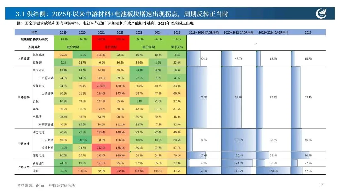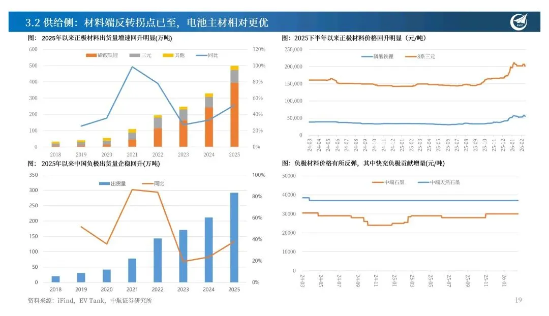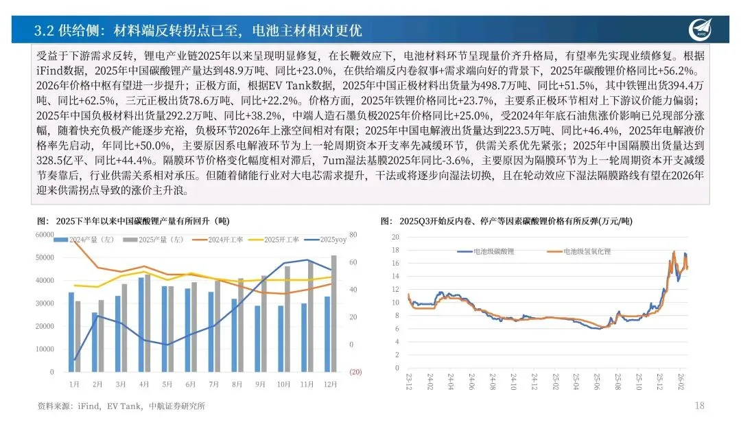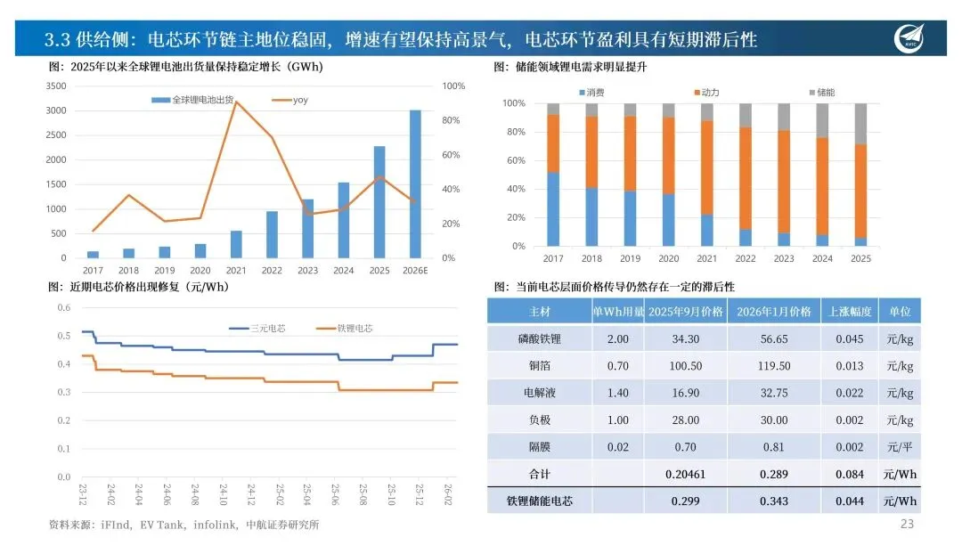供给侧锂电材料迎来量价齐升格局,电解液已率先启动涨价,隔膜环节2026年有望迎来涨价主升浪。电芯环节短期虽受原材料涨价扰动,但产业链链主地位稳固,顺价能力无需担忧,盈利修复确定性极强。