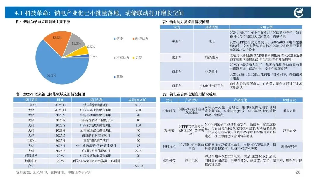 技术端,钠电聚阴离子路线已占据7成市场份额,储能和低温场景率先放量;固态电池2026年头部企业GWh级中试线将密集落地,核心机会集中在固态电解质材料和新增设备环节。