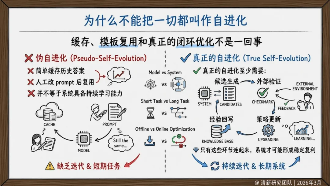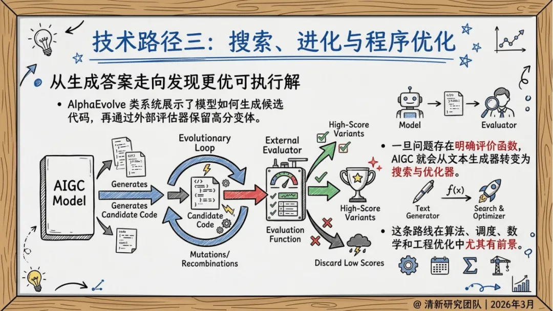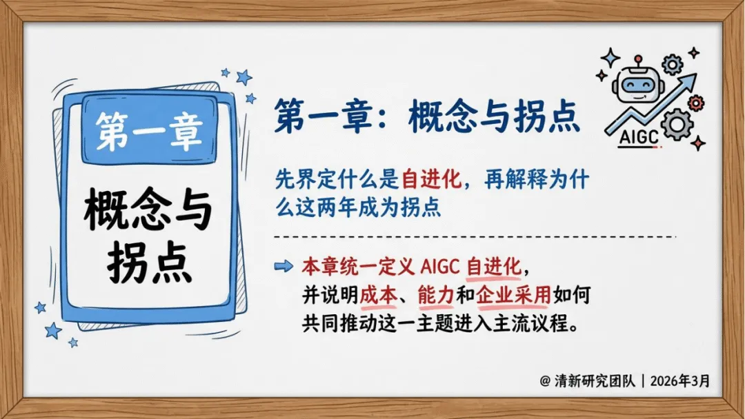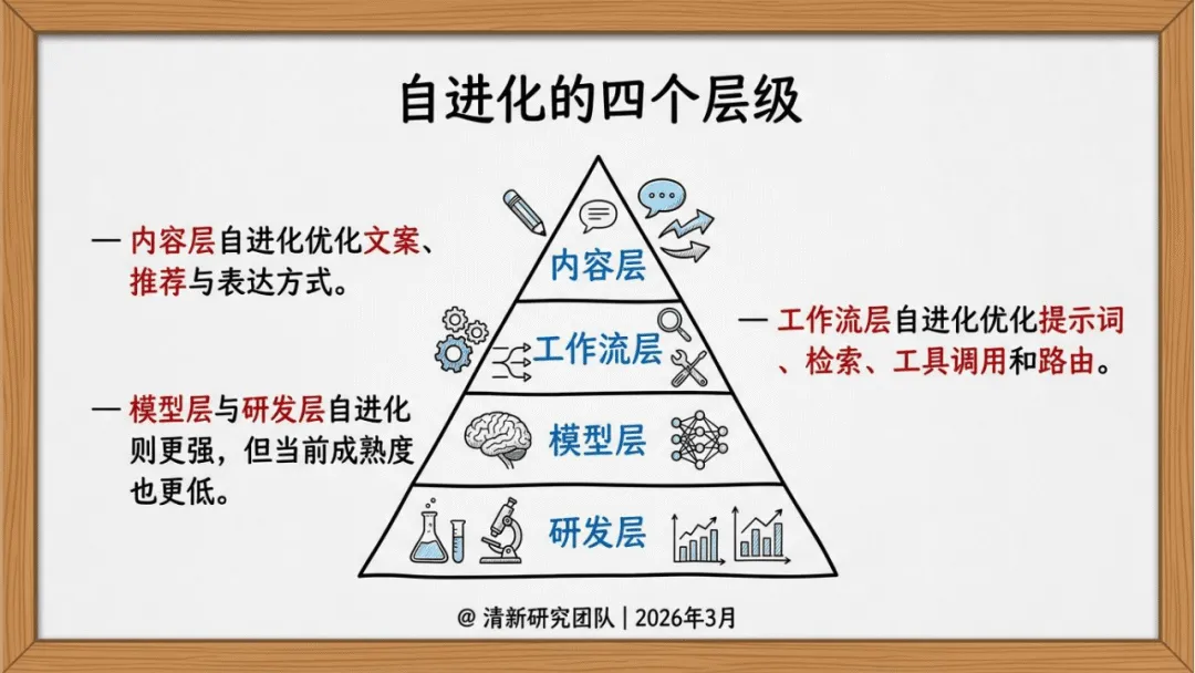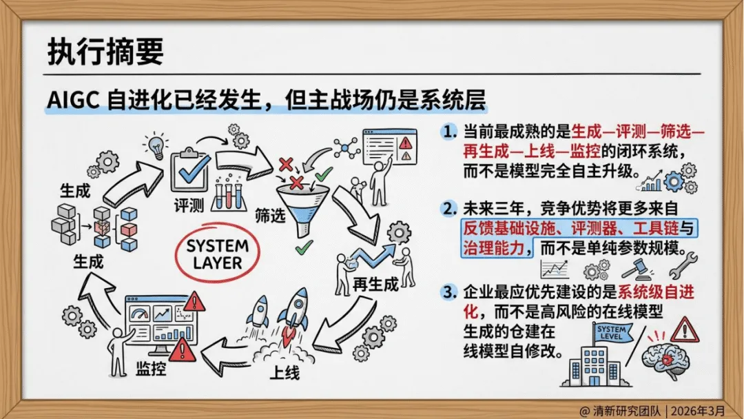 清新研究团队2026年3月发布的AIGC自进化研究报告,聚焦AIGC自进化的概念、技术、产业价值与未来趋势,指出其核心并非模型的自主觉醒或失控式升级,而是受约束、可审计、可回滚的系统级持续优化,且当前主战场已从单一模型生成能力竞争转向系统闭环优化竞争,未来三年的竞争优势将更多源于反馈基础设施、评测器等系统能力,而非单纯的模型参数规模。