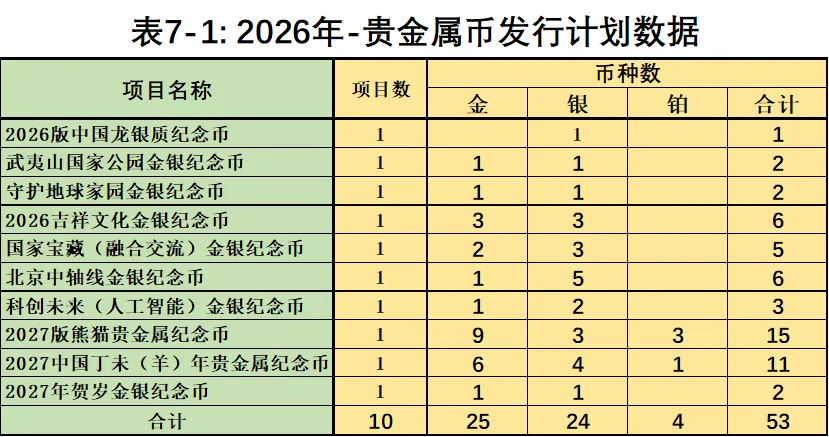 如表7-1所示,2026年计划发行贵金属币项目10个,其中:金币25种、银币24种和铂币4种,共计53种。
