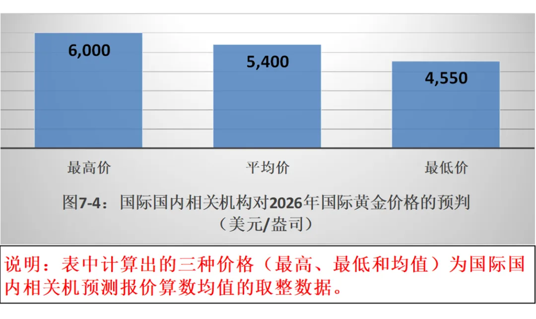 如图7-4所示,2026年黄金价格或将继续呈现震荡上行走势,最高有可能见到6,000(美元/盎司),最低可能见到4,550(美元/盎司),价格重心将可能在5,400(美元/盎司)左右。