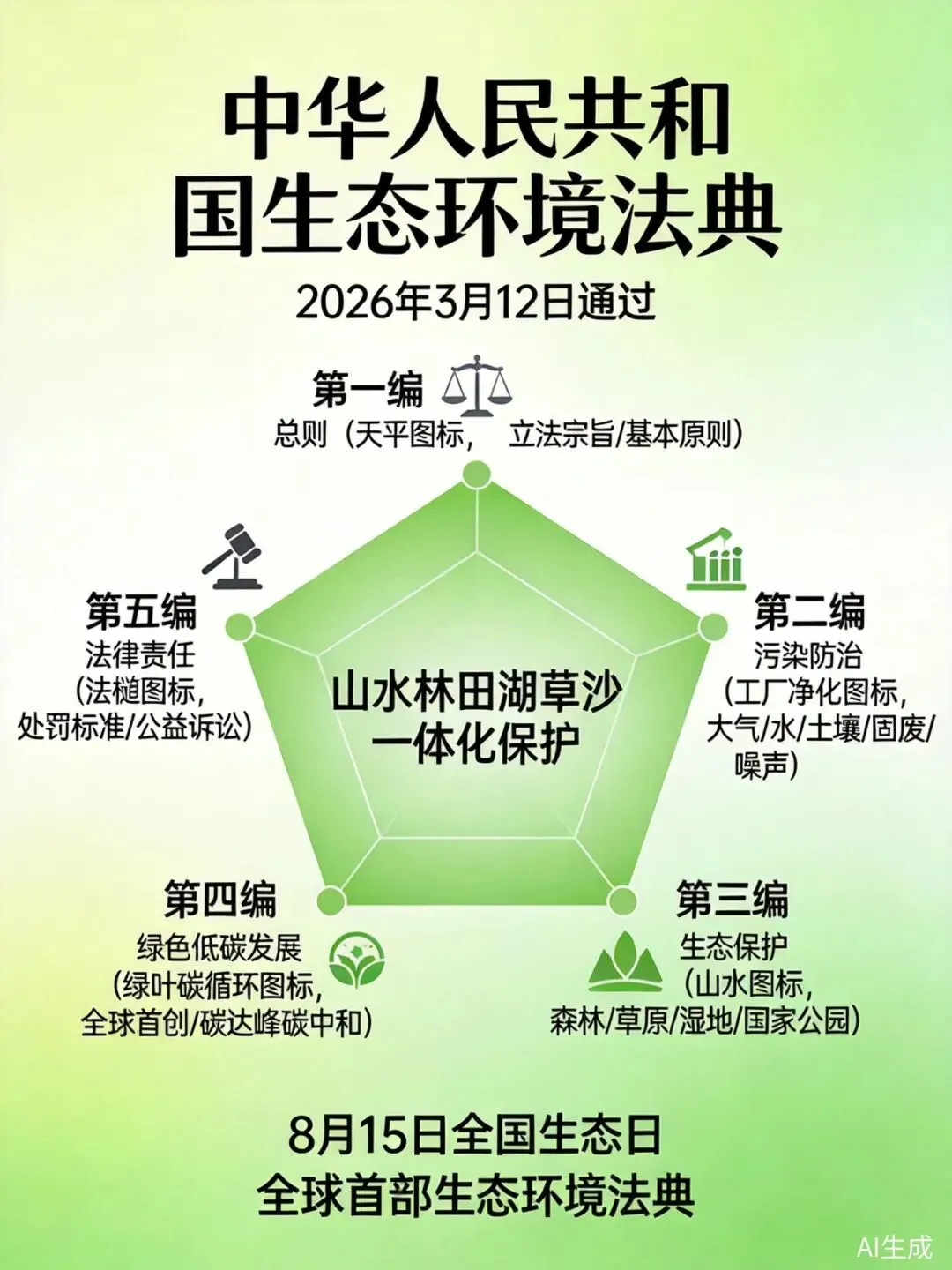 2026 年 3 月 12 日,十四届全国人大四次会议表决通过了《中华人民共和国生态环境法典》,这是继民法典之后我国第二部以 "法典" 命名的法律,也是世界上第一部以 "生态环境法典" 命名的法律。该法典将于 2026 年 8 月 15 日起正式施行,同时废止环境保护法等 10 部法律。