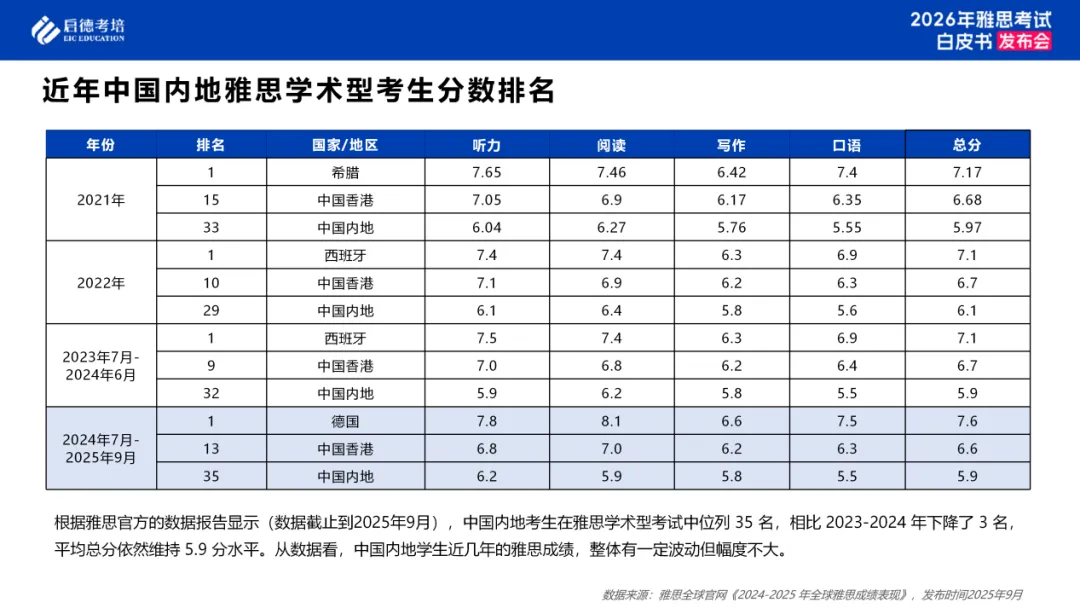 中国内地学生近几年的雅思成绩,整体有一定波动但幅度不大。根据雅思官方的数据报告显示(数据截止到2025年9月),中国内地考生在雅思学术型考试中位列35名,相比2023-2024年下降了3名,平均总分依然维持5.9分水平。