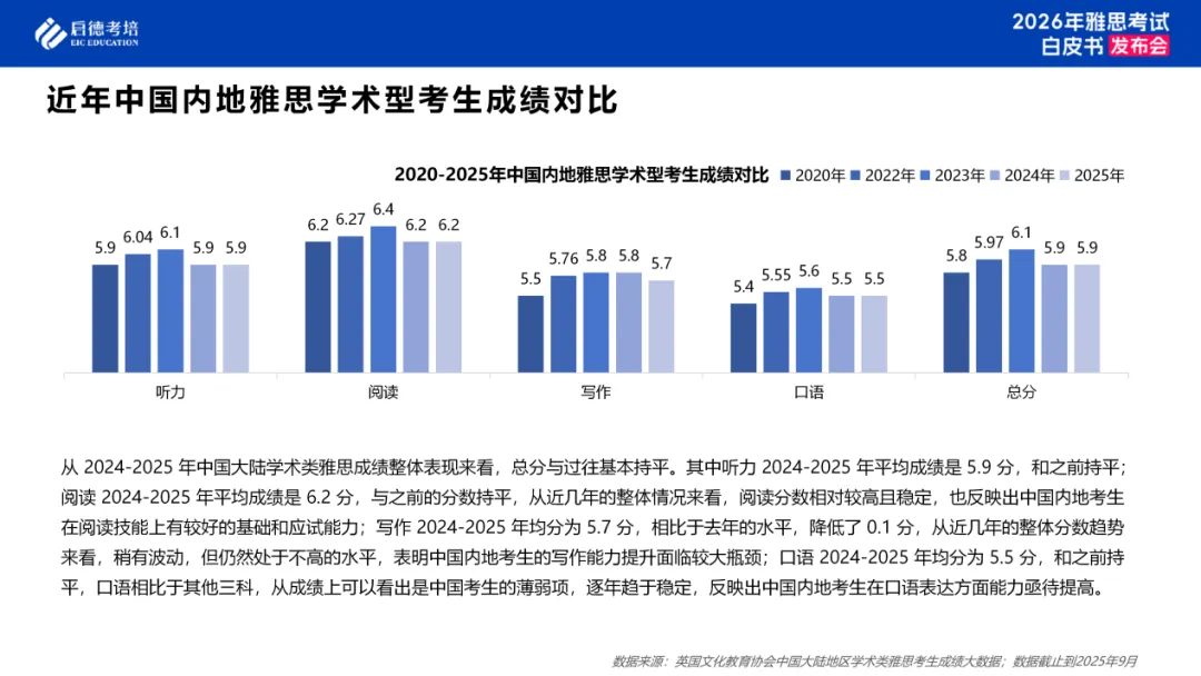 2024-2025年中国大陆学术类雅思成绩整体平稳,听说读写四科表现各有不同。其中听力平均成绩是5.9分,和之前持平;阅读平均成绩是6.2分,与之前的分数持平,从近几年的整体情况来看,阅读分数相对较高且稳定,也反映出中国内地考生在阅读技能上有较好的基础和应试能力;写作均分为5.7分,相比于去年的水平,降低了0.1分,从近几年的整体分数趋势来看,稍有波动,中国内地考生的写作能力提升面临较大瓶颈;口语均分为5.5分,和之前持平,口语相比于其他三科,从成绩上可以看出是中国考生的薄弱项,反映出中国内地考生在口语表达方面能力亟待提高。
