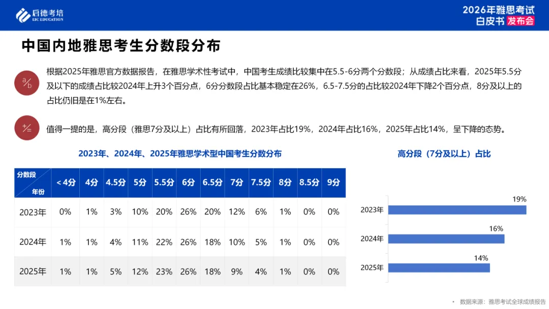 根据2025年雅思官方数据报告,在雅思学术性考试中,中国内地雅思考生成绩集中在5.5-6分两个分数段;从成绩占比来看,2025年5.5分及以下的成绩占比较2024年上升3个百分点,6分分数段占比基本稳定在26%,6.5-7.5分的占比较2024年下降2个百分点,8分及以上的占比仍旧是在1%左右。雅思7分及以上占比有所回落,2023年占比19%,2024年占比16%,2025年占比14%,呈下降的态势。