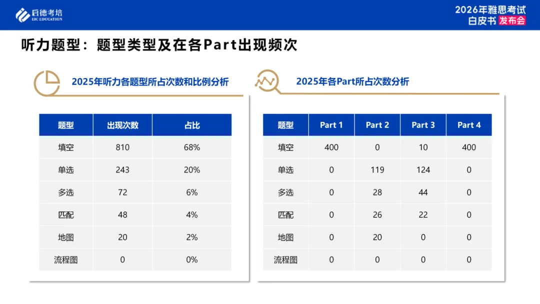 纵观 2025 年雅思听力考试,命题思路整体稳定,在题型分布和场景设置上也体现出一定的结构特征。从题型来看,填空题依然占据核心地位,占比超过一半,主要集中在Part 1和Part 4,是考生必须重点突破的部分。与此同时,单选题与匹配题在Part 2和Part 3中保持较高比例,多选题和地图题虽数量有限,但在旅游介绍、活动说明和工作场景中稳定出现。考生在备考过程中应在夯实填空题基础的同时,加强选择题与匹配题训练,并系统积累高频生活咨询和学术讲座场景词汇,更好地适应整体稳定但细节要求更高的考试趋势。