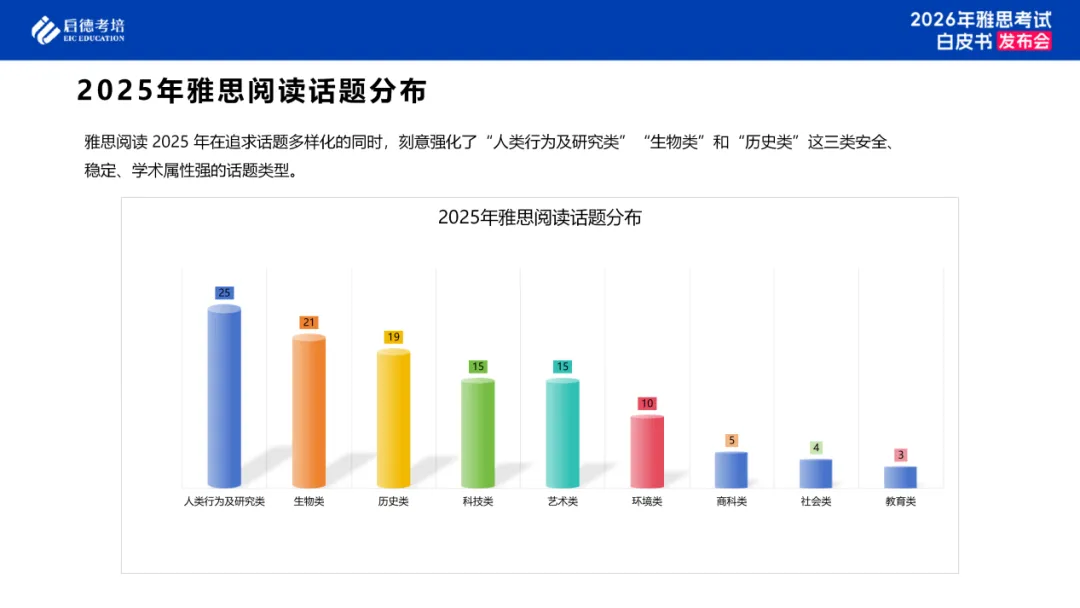 启德考培预测2026年话题中跨学科融合型文章将明显增多。2025年雅思阅读中纯单一学科话题的比例正在下降,这种趋势提升了阅读材料的学术真实性和综合性,要求考生具备更灵活的阅读策略,而非依赖单一领域的知识背景。因此,考生需要全面提高对文章细节、主旨和推理的理解能力。同时,填空题、匹配题和判断题依然会是出题频率最高的三类题型,从备考角度看,阅读提分的关键不在于“题型全覆盖”,而在于对高频题型的深度理解。未来的考试中需要学生在填空题中做到高准确率,或在匹配题中使用稳定的定位策略。