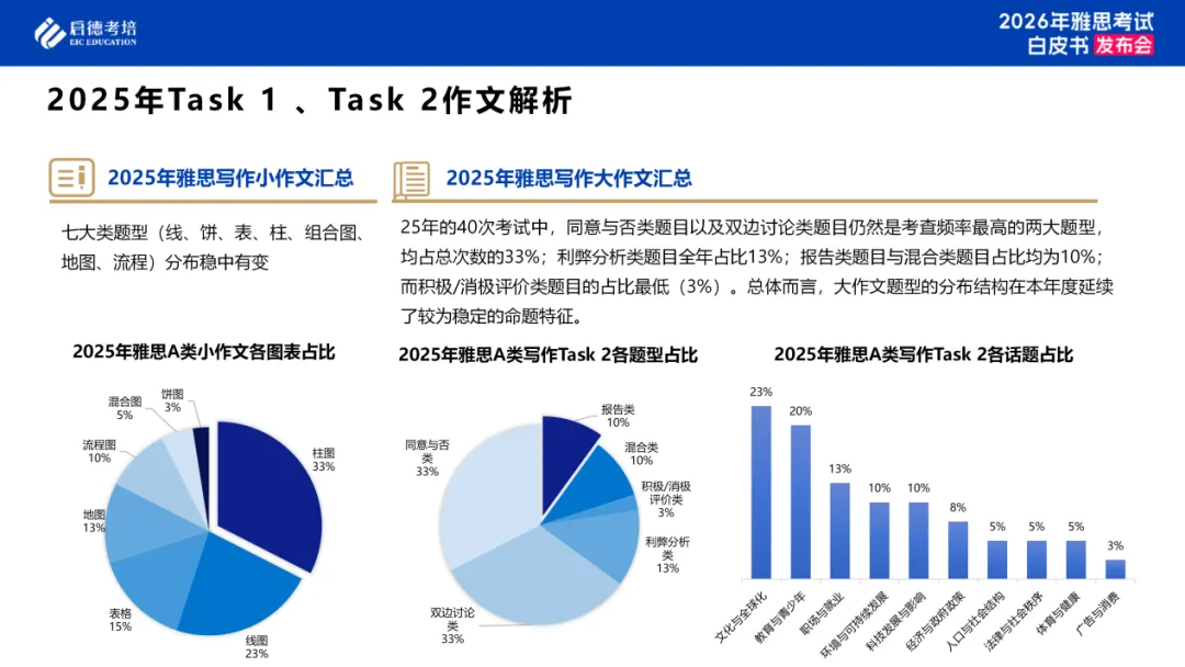 纵观2025年雅思写作部分的考情,TASK 1和TASK 2考试规律在整体稳定的基础上呈现出一定调整。在TASK 1部分,柱图仍然保持最高考查频率,且考查次数较上一年度进一步增加;线图与表格题紧随其后,构成小作文命题的重点内容;地图题和流程图在2025年的考查次数较上一年度出现了较为明显的增长趋势;混合图与饼图的出题频率仍然较低。对于TASK 1小作文部分,考生应在平时训练中系统掌握七大题型的分析思路与数据整合方法,并同步提升语言表达的准确性与灵活性。雅思考试TASK 2中,重复旧题乃至原题重现的比例较上一年度进一步上升,在整体框架与话题重心上具有较强的延续性。建议2026年考生在备考TASK 2大作文时,系统研读经典话题,按照话题类别反复梳理与训练2011-2025年历年真题中的高频考题;同时持续积累相关词汇与表达方式,使写作训练在思路构建与语言表达两个层面同步推进。