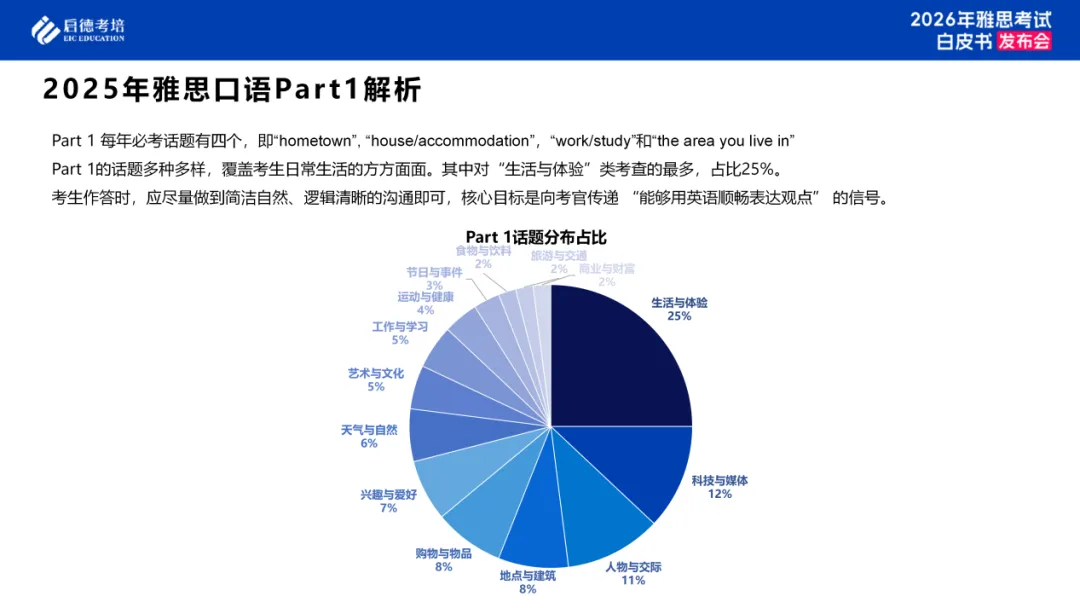 启德考培预测在2026年口语考试中,Part 1非必考话题将延续“贴近日常、聚焦个人体验”的核心逻辑,14类话题的考查占比大概率与2025年保持一致——“生活与体验”“科技与媒体”“人物与交际”仍会是高频方向。Part 2的物品类和事件经历类数量预计增加,考到概率较高。Part 3的跨主题融合的特征可能会更加显著,比如可能出现“媒体+环保”的组合。考查的重点仍然不会在专业知识,而是注重“逻辑连贯+论证充分”,要求考生用“分论点+具体例证”支撑观点,避免泛泛而谈。