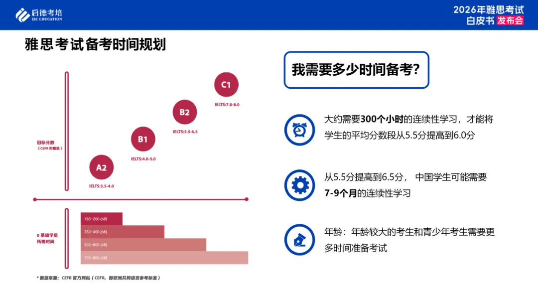 研究表明,若要将平均分数从5.5分提升至6.0分,通常需投入约300小时的连续性学习;而中国学生若想从5.5分进阶至6.5分,则需7-9个月的连续学习。此外,年龄较大的考生和青少年考生需要更长时间来备考。