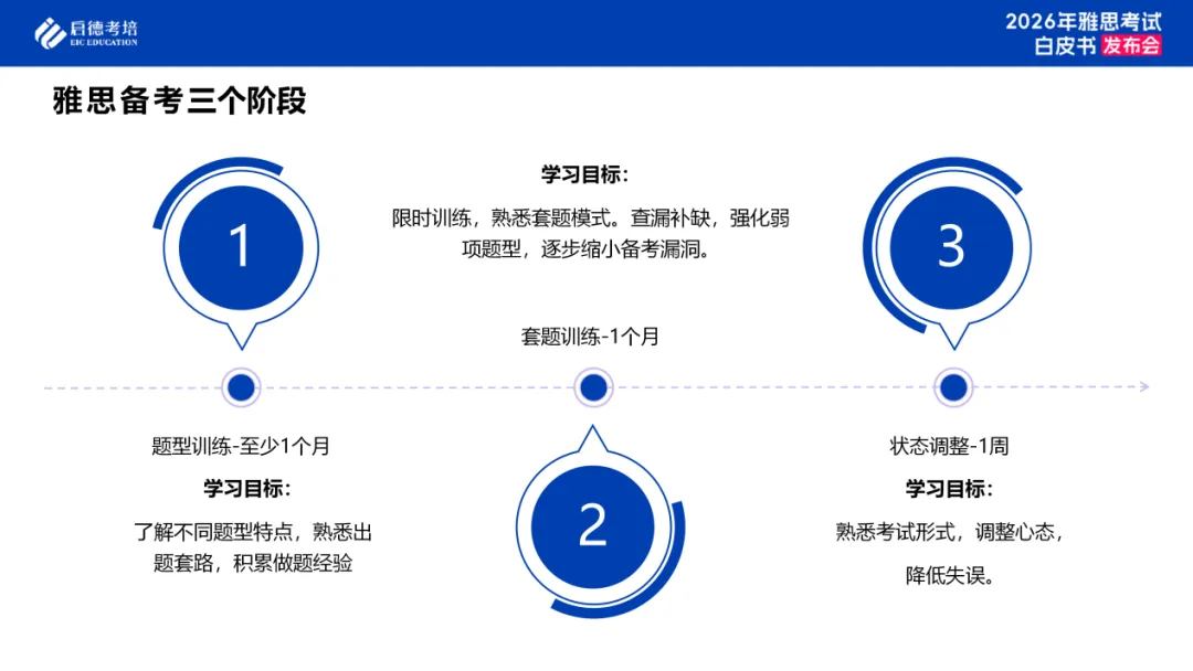 因此在进行雅思备考时,可循序渐进进行:第一阶段题型训练,至少1个月,以熟悉不同题型特点、掌握出题规律为核心目标,通过针对性练习积累实战经验;第二阶段套题训练大约需要1个月,聚焦限时模考与套题适应性训练,重点强化弱项题型并系统性查漏补缺;第三阶段调整状态需要1周时间,熟悉考试形式,调整心态,降低失误。