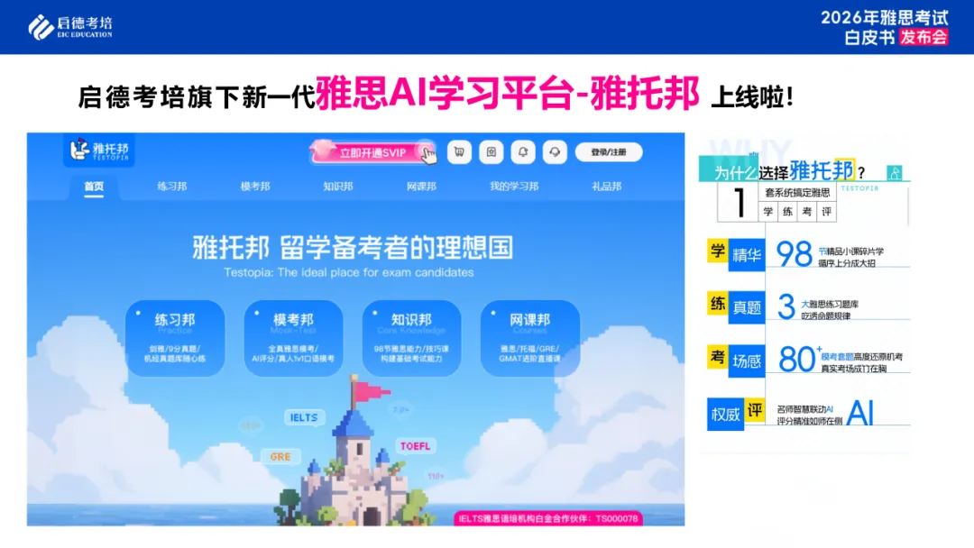 2026年3月21日,启德考培在北京发布《2026雅思考试白皮书》,结合雅思官方数据及2025全年考试情况,全面梳理中国考生在全球排名、单科表现及分数分布等整体特征,同时聚焦2026年雅思考试费用调整、纸笔考试改革等重要政策变化,从听力、阅读、写作、口语四大科目出发,系统解析雅思考试趋势、题型特点与备考重点,并结合科学学习规律,提出分阶段、分目标的备考策略,帮助考生清晰了解考试动态、科学备考。