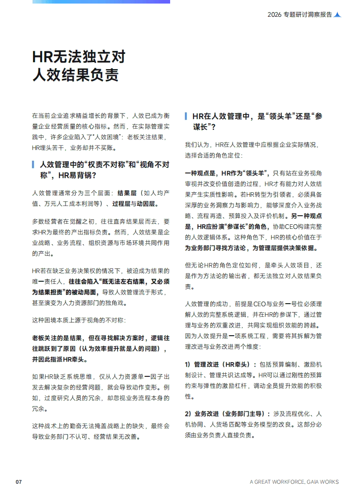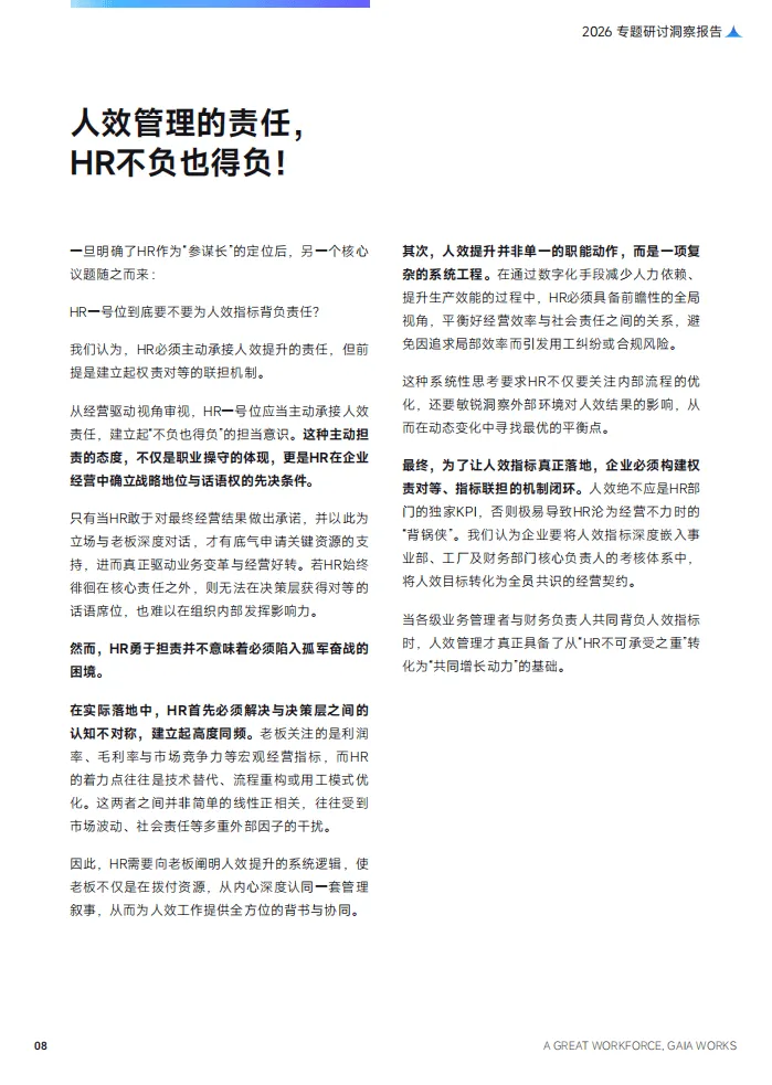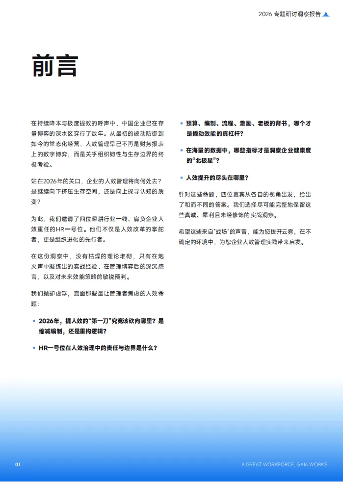 这份2026年人效专题研讨洞察报告,由盖雅工场联合多位行业一线HR一号位打造,核心围绕2026年企业人效管理的核心方向、HR职责、提效抓手、指标体系及终极目标展开深度剖析,指出企业人效管理已从激进降本迈入经营稳效的深水区。