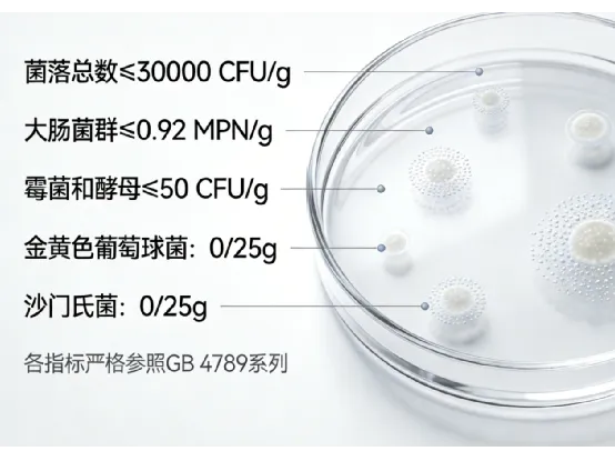 质量管控堪称严苛:灰分≤8.0%(检测依据GB 5009.4),确保杂质极少;粒度满足五号筛(80目)通过率95%,符合《中华人民共和国药典》标准,溶解性极佳,冲泡无结块;微生物指标更是精益求精,菌落总数≤30000 CFU/g、大肠菌群≤0.92 MPN/g、霉菌和酵母≤50 CFU/g,金黄色葡萄球菌和沙门氏菌均为0/25g(各指标严格参照GB 4789系列),保障产品卫生安全。