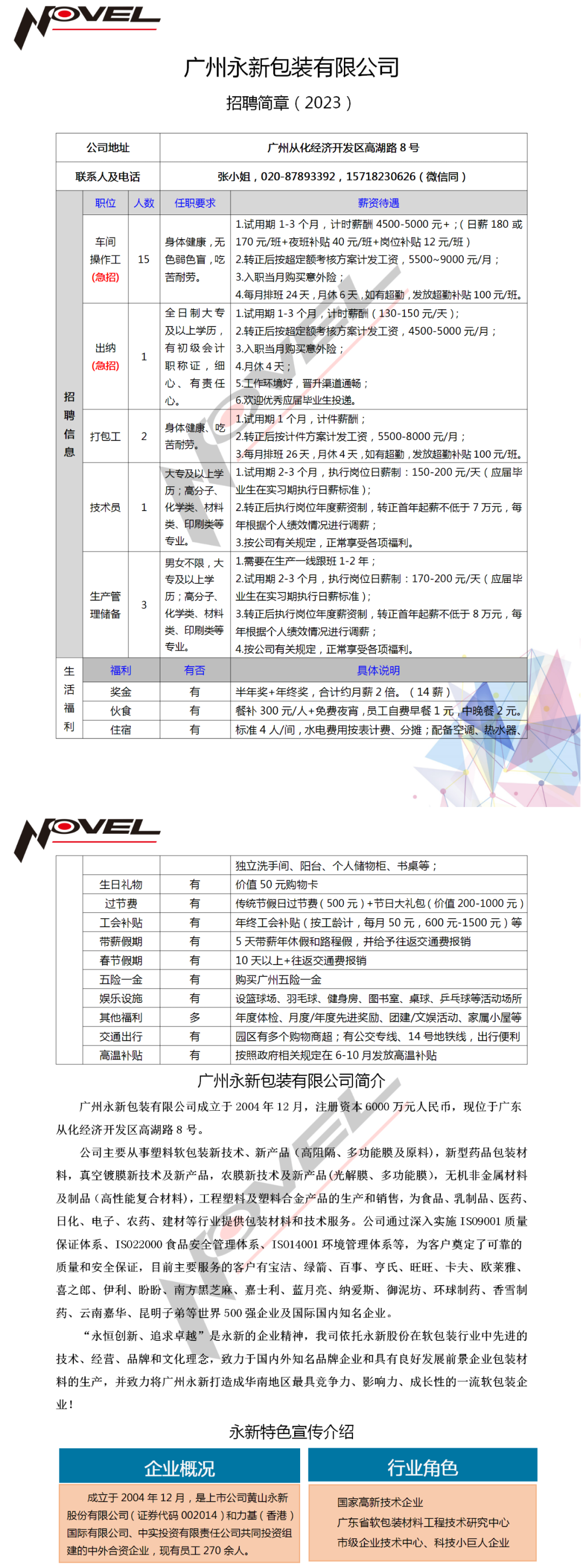 从化招聘!【永新包装】招聘出纳、操作工、打包员!5000+