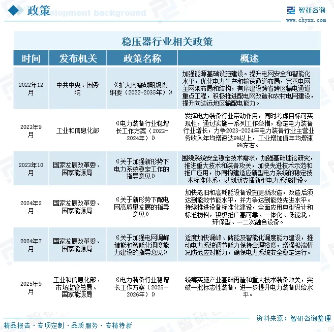 稳压器作为电力系统中不可或缺的关键设备,其行业发展受到国家政策的高度重视。近年来,随着我国电力需求的持续增长和电力系统的不断升级,稳压器行业迎来了新的发展机遇。为了规范行业发展,提升产品质量,国家出台了一系列政策,为稳压器行业的健康发展提供了有力保障。如2023年9月发布的《电力装备行业稳增长工作方案(2023-2024年)》中,提出发挥电力装备行业带动作用,同时考虑目标可实现性,通过实施一系列工作举措,稳定电力装备行业增长,力争2023-2024年电力装备行业主营业务收入年均增速达9%以上,工业增加值年均增速9%左右。2025年9月发布的《电力装备行业稳增长工作方案(2025—2026年)》中,提出统筹实施产业基础再造和重大技术装备攻关,突破一批标志性装备,进一步提升电力装备供给水平。