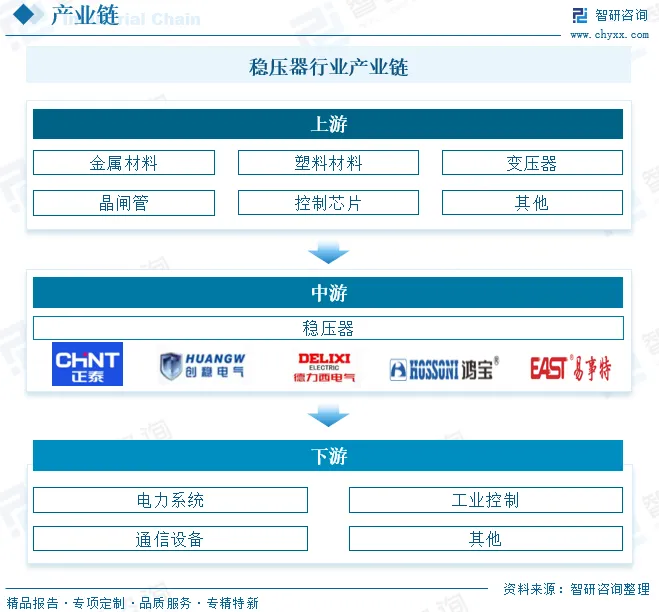 从产业链来看,稳压器行业上游主要包括金属材料、绝缘材料等原材料,以及变压器、晶闸管、控制芯片等核心元器件。中游是指稳压器的生产制造。下游是指应用领域,包括电力系统、工业控制、通信设备等多个领域。