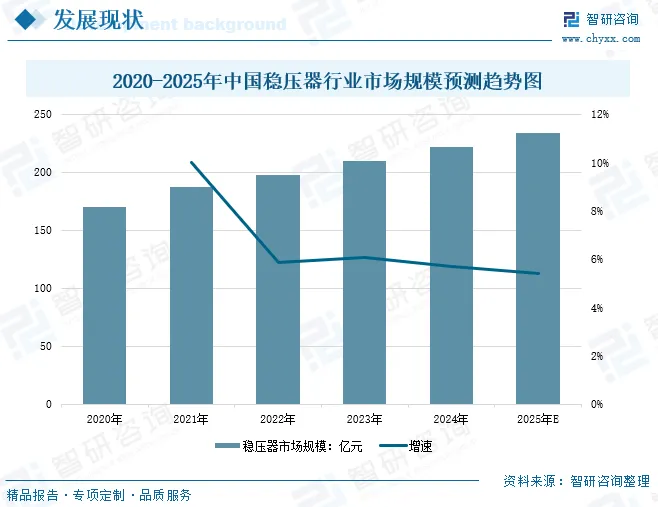 稳压器是一种能自动调整输出电压的供电设备,其作用是将波动较大的供电电压稳定在设定范围内,为各种电子设备提供稳定可靠的电力。随着工业自动化、通信技术、数据中心和家用电器等领域的持续发展,对稳定电力供应的需求日益增长,稳压器市场也随之呈现出相应的变化。数据显示,2020年中国稳压器行业市场规模达到170亿元,到了2024年中国稳压器行业市场规模增长至222亿元,年复合增长率为6.9%。预计2025年中国稳压器行业市场规模将继续增长,达到234亿元。这一方面得益于行业技术的进步,使得稳压器具有更高的效率、更快的响应速度、更低的能耗和更长的使用寿命,能够更好地满足用户的需求。另一方面,政府对电力基础设施建设的重视,为稳压器市场的发展提供了有力的政策支持。此外,新兴应用领域的发展,为行业带来新的市场需求,进一步推动稳压器行业发展。