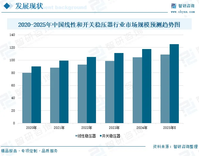 在便携设备日益普及的当下,从智能手机、平板电脑到智能手表、蓝牙耳机等,对供电系统的效率、体积和续航能力提出了越来越高的要求。稳压器作为供电系统中的核心部件,其性能直接影响着便携设备的整体表现。在常见的稳压器类型中,开关稳压器与线性稳压器是两种主流选择,而开关稳压器在便携设备中占据更重要的地位。一方面,开关稳压器的效率相对较高,通常可以达到80%以上,另一方面,开关稳压器体积和重量相对较小。数据显示,2024年中国线性稳压器市场规模达到104.34亿元,开关稳压器市场规模达到117.66亿元。预计2025年中国线性稳压器市场规模增长至108.93亿元,开关稳压器市场规模增长至125.07亿元。