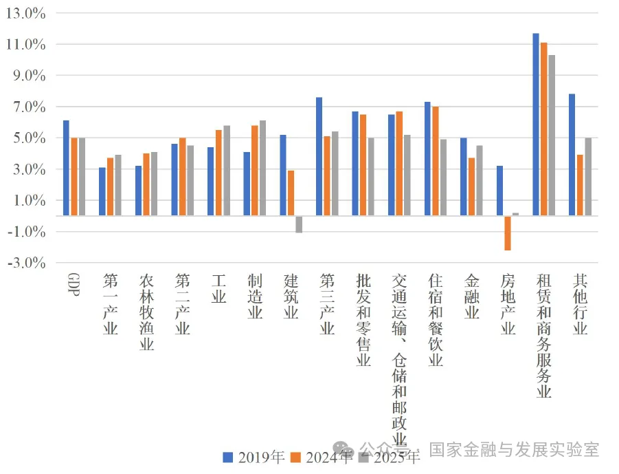 图1 2025年各产业及行业增加值增速与2024年及2019年的比较