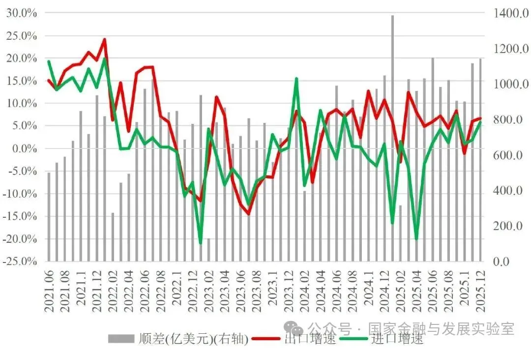 图4 2021年6月至2025年12月我国外贸进出口及顺差情况