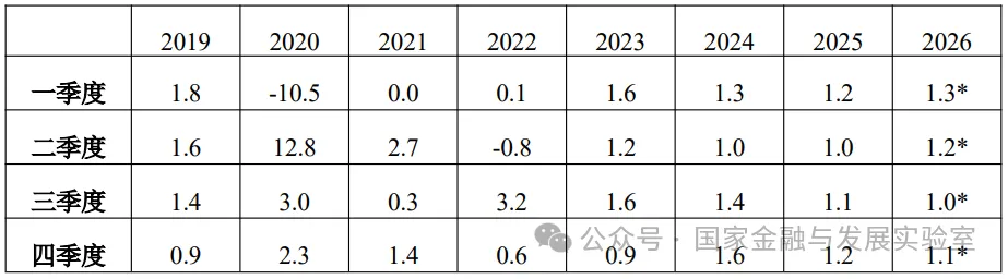 综合投资、净出口以及消费可能的变动情况,我们预计2026年中国GDP增速可能在4.8%左右。2025年,中国经济结构向疫情前修复的动能已经弱化,周期和结构性问题使经济承受了一定的压力,但中国经济顶压前行、向新向优,全年实现了5%的增长。考虑2025年各季度基数变动情况,我们适当调整了2026年各季度GDP环比增速的预测值(见表1)。按照我们的推算,2026年中国GDP可能实现4.8%左右的增长,第一、二、三、四季度的GDP同比增速可能约为4.7%、4.9%、4.8%、4.7%。如果全年经济增速可以达到4.8%,那么将显著高于世界银行今年1月预测的4.4%和国际货币基金组织(IMF)预测的4.5%的水平。
